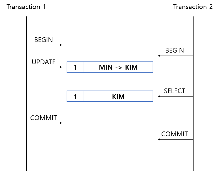 위의 그림에서 트랜잭션 2의 첫 번째 조회엔 MIN이, 두 번째 조회엔 KIM이 검색되고 있다.